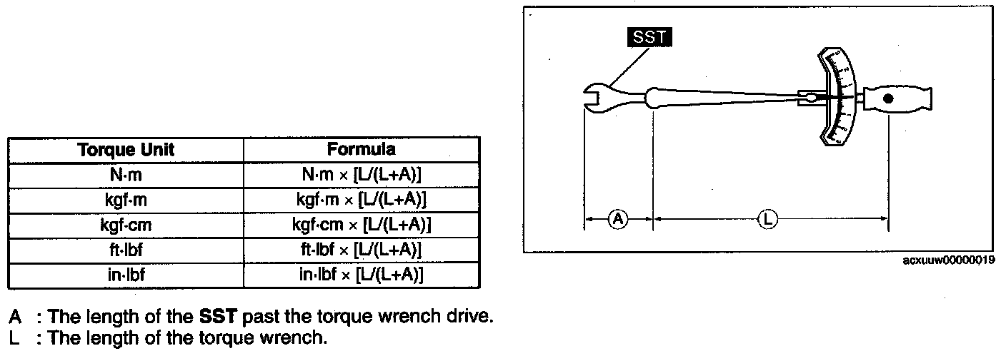 - When using a torque wrench-SST or equivalent combination, the specified torque must be recalculated due to the extra length that the SST or equivalent adds to the torque wrench. Recalculate the torque by using the following formulas. Choose the formula that applies to you.