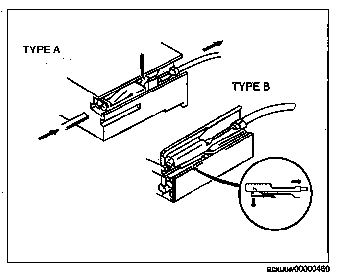 - Use the appropriate tools to remove a terminal as shown. When installing a terminal, be sure to insert it until it locks securely.