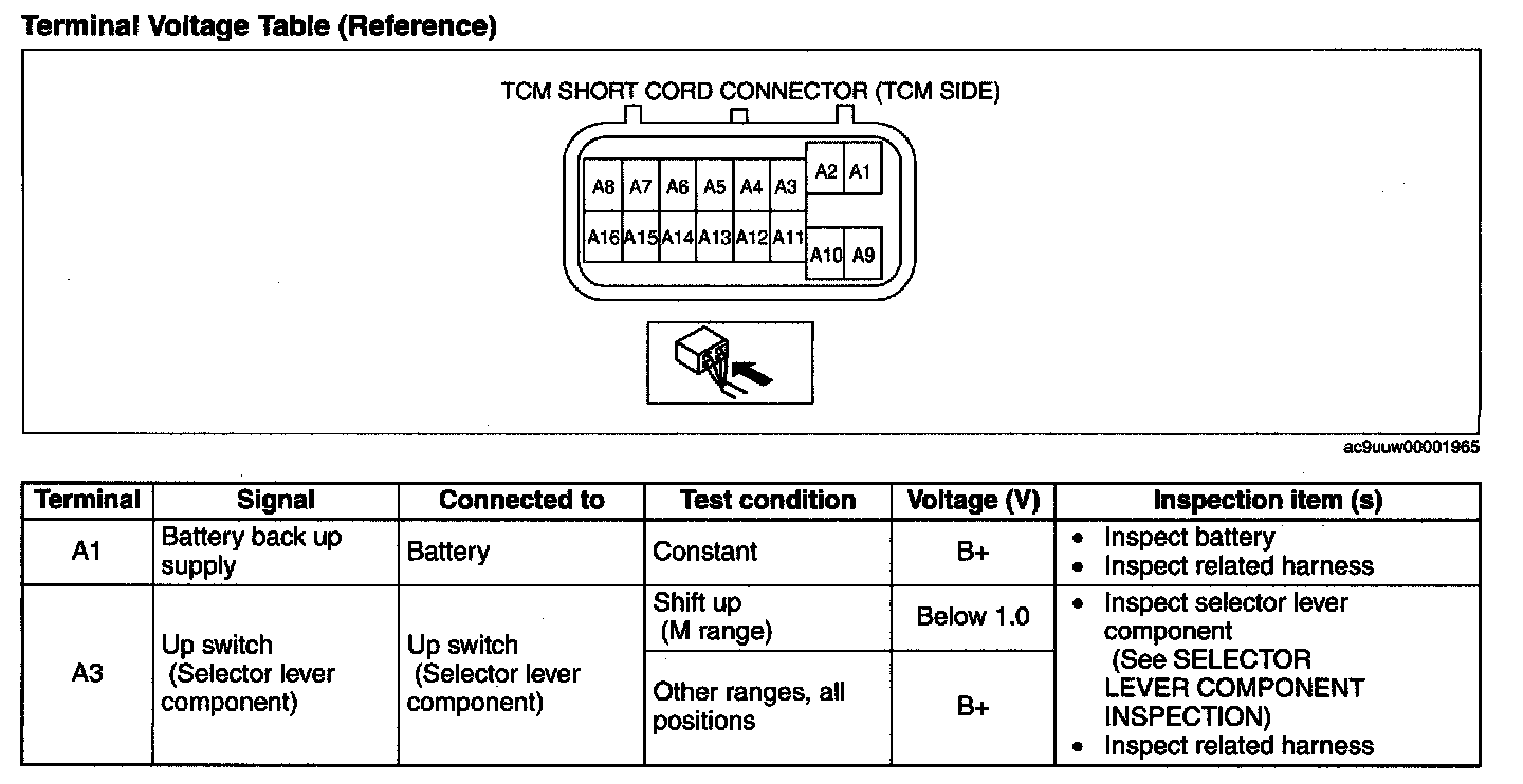 2. Measure the voltage at each TCM connector (wiring harness-side) terminal and refer to the terminal voltage table. If the voltage is not as specified in the Terminal Voltage Table (Reference), inspect the parts under "Inspection item (s)".