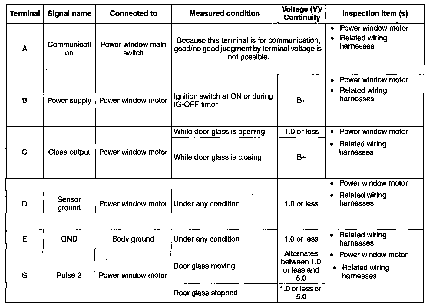 - If the voltage is not as specified in the Terminal Voltage Table, inspect the parts under "Inspection item(s)" and related wiring harnesses.