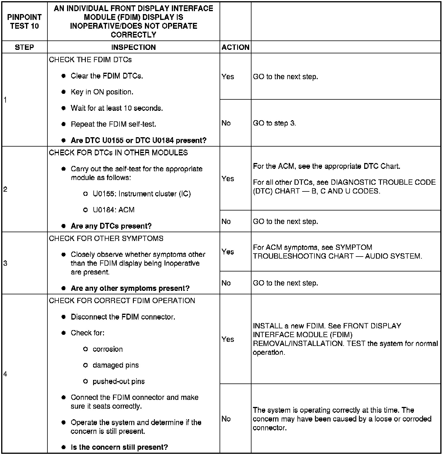 Pinpoint Test 10: An Individual Front Display Interface Module (FDIM) Display Is Inoperative/Does Not Operate Correctly