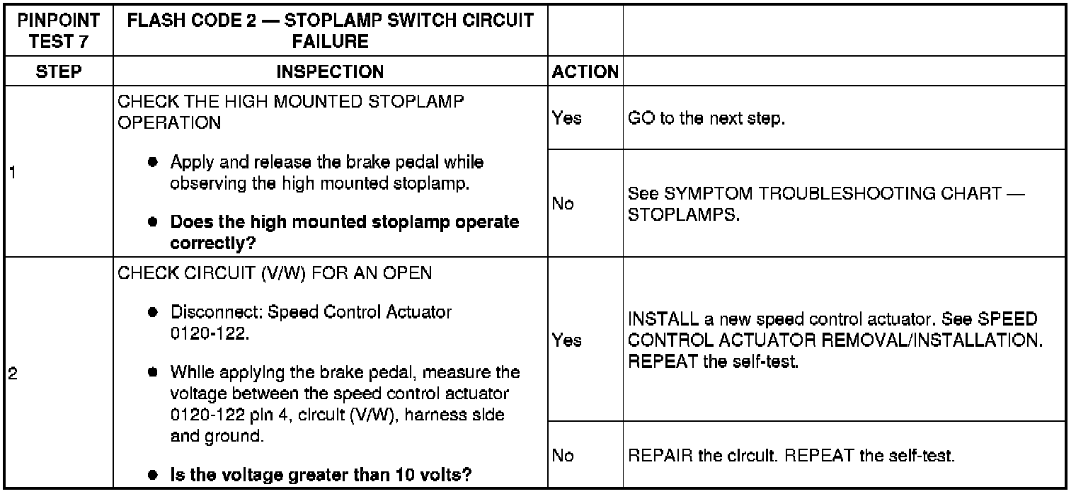 PINPOINT TEST 7: FLASH CODE 2 - STOPLAMP SWITCH CIRCUIT FAILURE