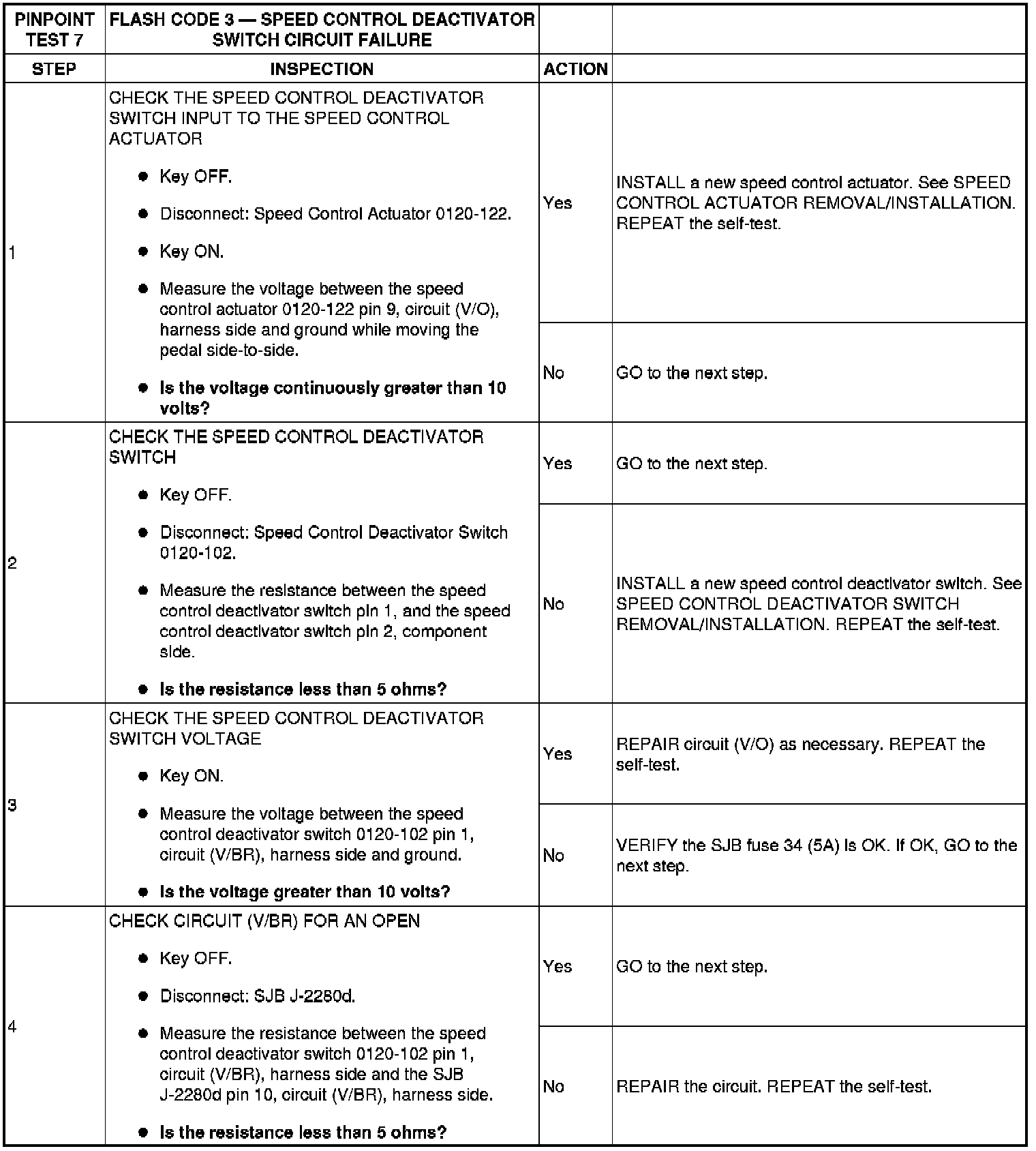 Pinpoint Test 8: Flash Code 3 - Speed Control Deactivator Switch Circuit Failure