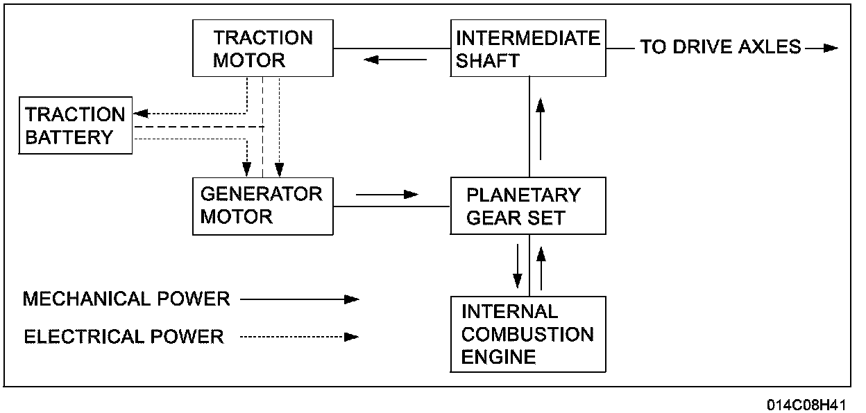 The hybrid electric system operates in the electric mode when the vehicle is propelled by the electrical power stored in the high voltage traction battery. The torque is supplied to the output shafts by the traction motor, the generator motor, or a combination of both. This is a preferred mode whenever the desired torque is low and the electrical system, rather than the engine, can produce it more efficiently. The electric mode is also used in reverse because the engine can deliver torque only in a forward direction.