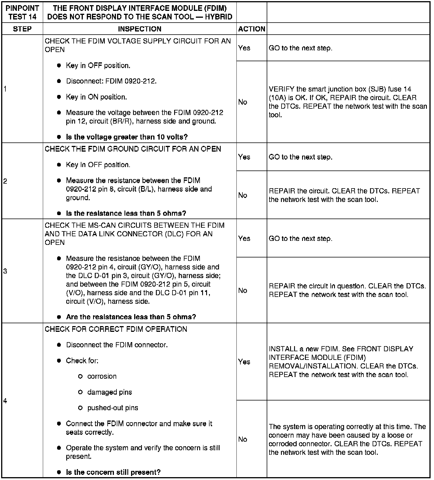 Pinpoint Test 14: The Front Display Interface Module (FDIM) Does Not Respond To The Scan Tool