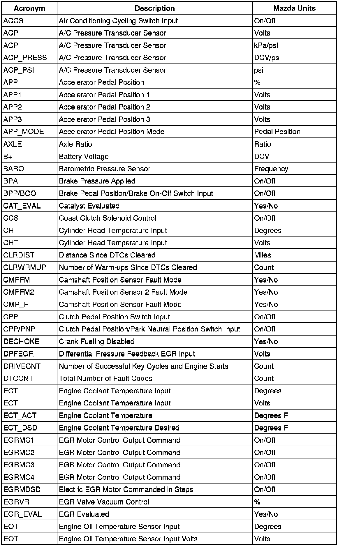 The parameter identification (PID) mode allows access to PCM information. This includes analog and digital signal inputs and outputs along with calculated values and the system status. There are 2 types of PID lists available and both are used throughout this information. The first is generic (J1979) OBD PID list. This is a standard set of PIDs that all scan tools must be able to access. The second is a Mazda-specific (J2190) list which can be accessed by an appropriate scan tool. When accessing any of these PIDs, the values are continuously updated. The generic or Mazda PID list provides definitions and values in appropriate units. For more information, refer to the Society of Automotive Engineers (SAE) document J2205.