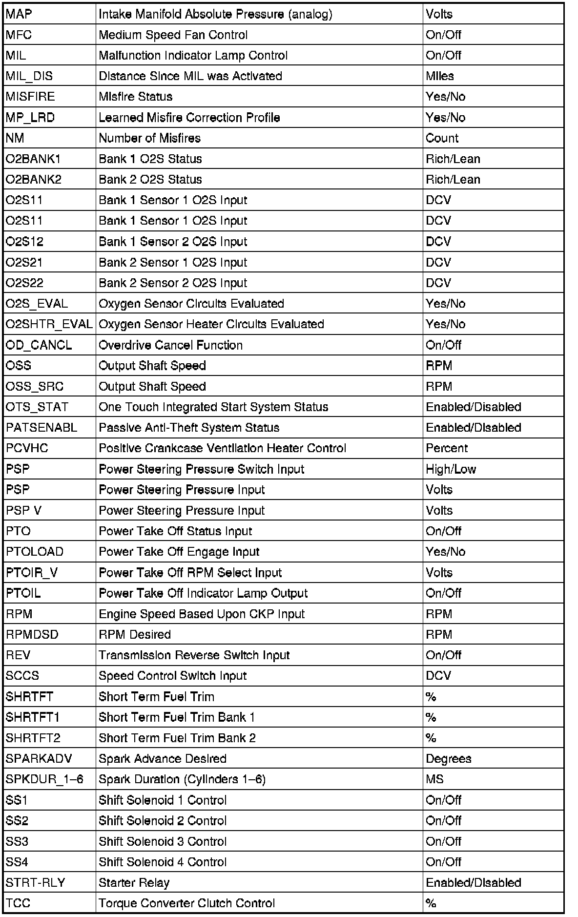1PID/DATA MONITOR ITEM TABLE