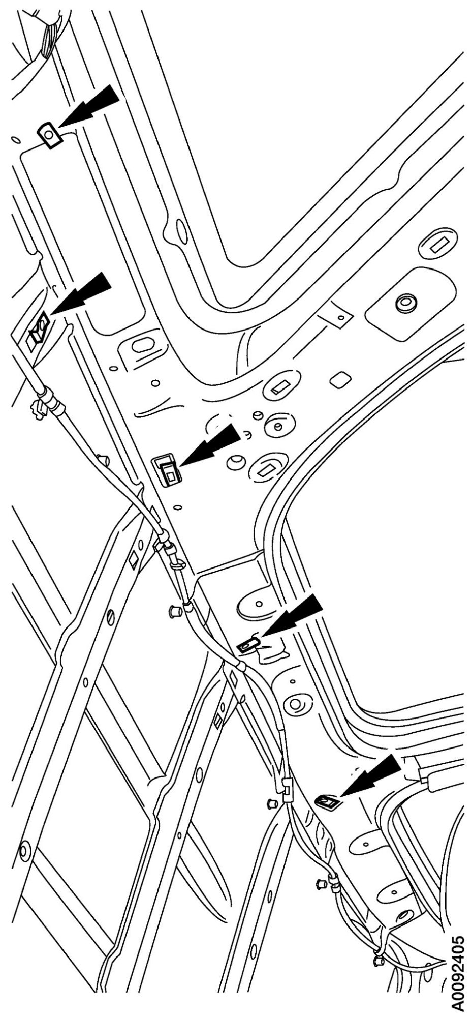 - If equipped with a moonroof and or rear window wiper assembly, note position and routing of the moonroof front drain hose and/or rear window washer solvent hose for installation purposes.