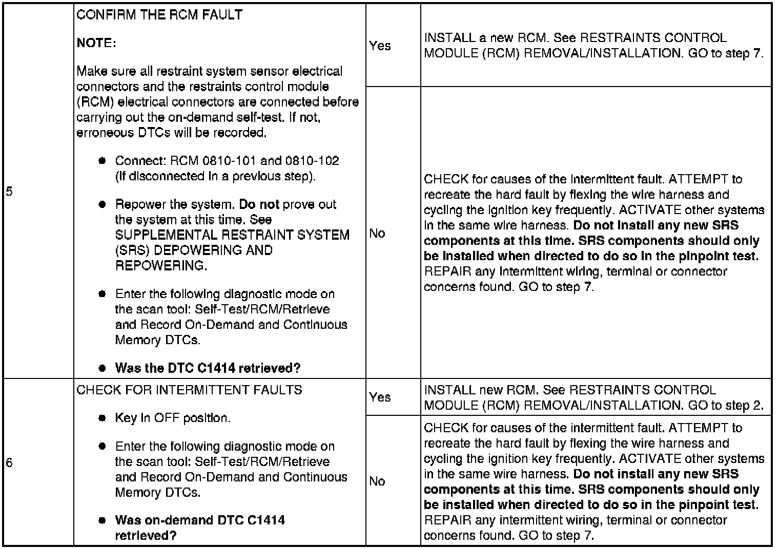 The restraints control module (RCM) monitors communication messages from the occupant classification sensor (OCS) system and the powertrain control module (PCM) for an embedded vehicle ID. If the RCM detects an unexpected condition or code from the occupant classification system module (OCSM) or PCM, it will store DTC C1414 in memory and send a message to the instrument cluster module to illuminate the air bag warning indicator.