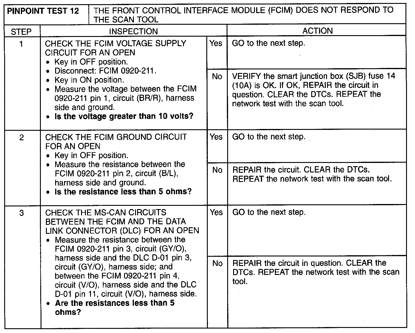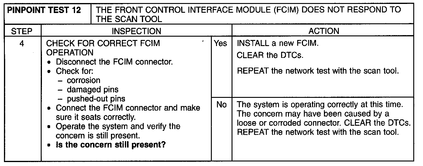 Pinpoint Test 12: The Front Control Interface Module (Fcim) Does Not Respond to the Scan Tool