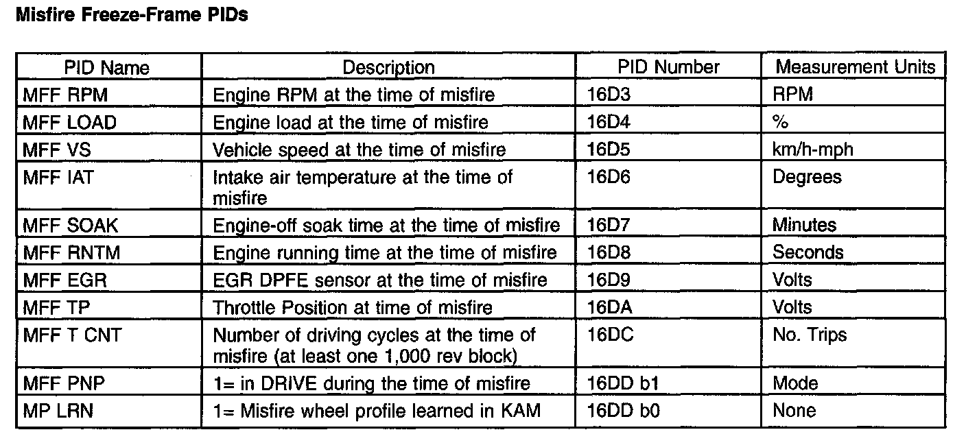 Some unique PIDs are stored in the keep alive memory (KAM) of the PCM to help in diagnosing the root cause of misfires. These PIDs are collectively called misfire freeze frame (MFF) data. These parameters are separate from the generic freeze frame data that is stored for every MIL code. They are used for misfire diagnosis only. The MFF data could be more useful for misfire diagnosis than the generic freeze frame data. It is captured at the time of the highest misfire rate, and not when the DTC is stored at the end of a 1,000 or 200 revolution block. (Generic freeze frame data for misfire can be stored minutes after the misfire actually occurred.)