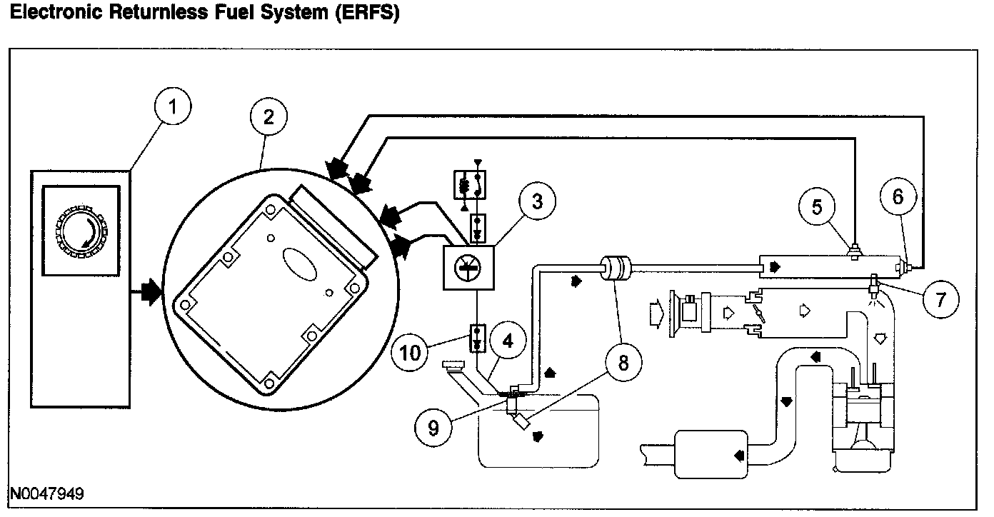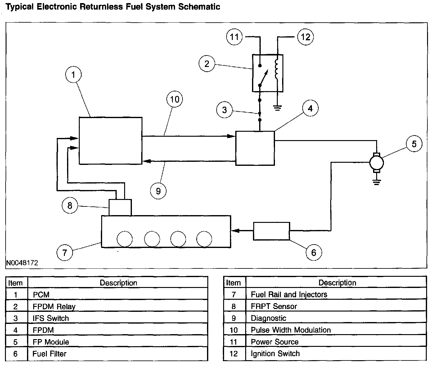 The fuel system supplies the sequential multiport fuel injection (SFI) fuel injectors with clean fuel at a controlled pressure. The PCM controls the fuel pump and monitors the fuel pump circuit. The PCM controls the fuel injector on/off cycle duration and determines the correct timing and amount of fuel delivered. When a new fuel injector is installed it is necessary to reset the learned values contained in the keep alive memory (KAM) in the PCM. See RESETTING THE KEEP ALIVE MEMORY (KAM).