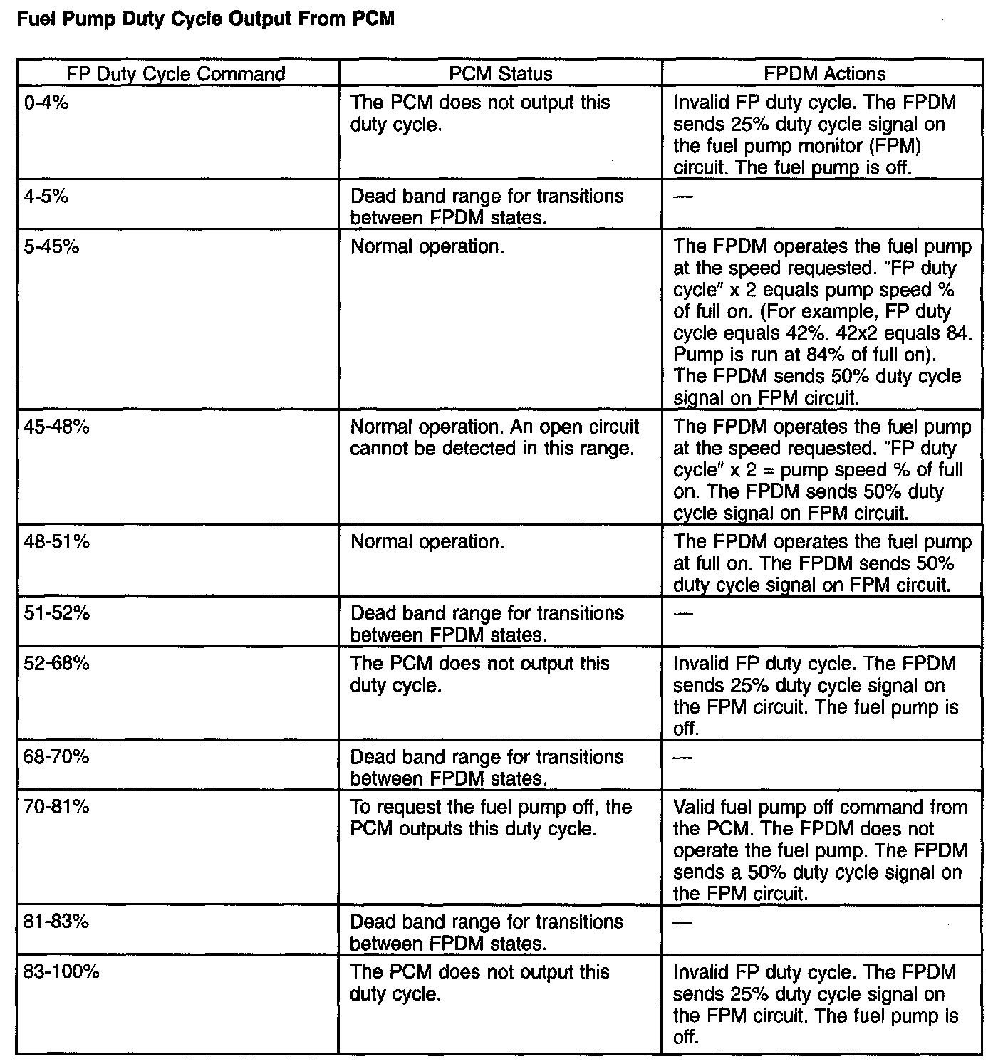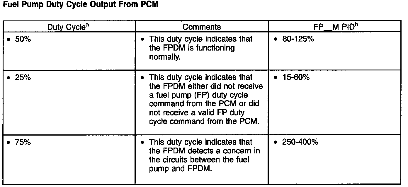 The FPDM communicates diagnostic information to the PCM through the FPM circuit. This information is sent by the FPDM as a duty cycle signal. The 3 duty cycle signals that may be sent are listed in the following table.