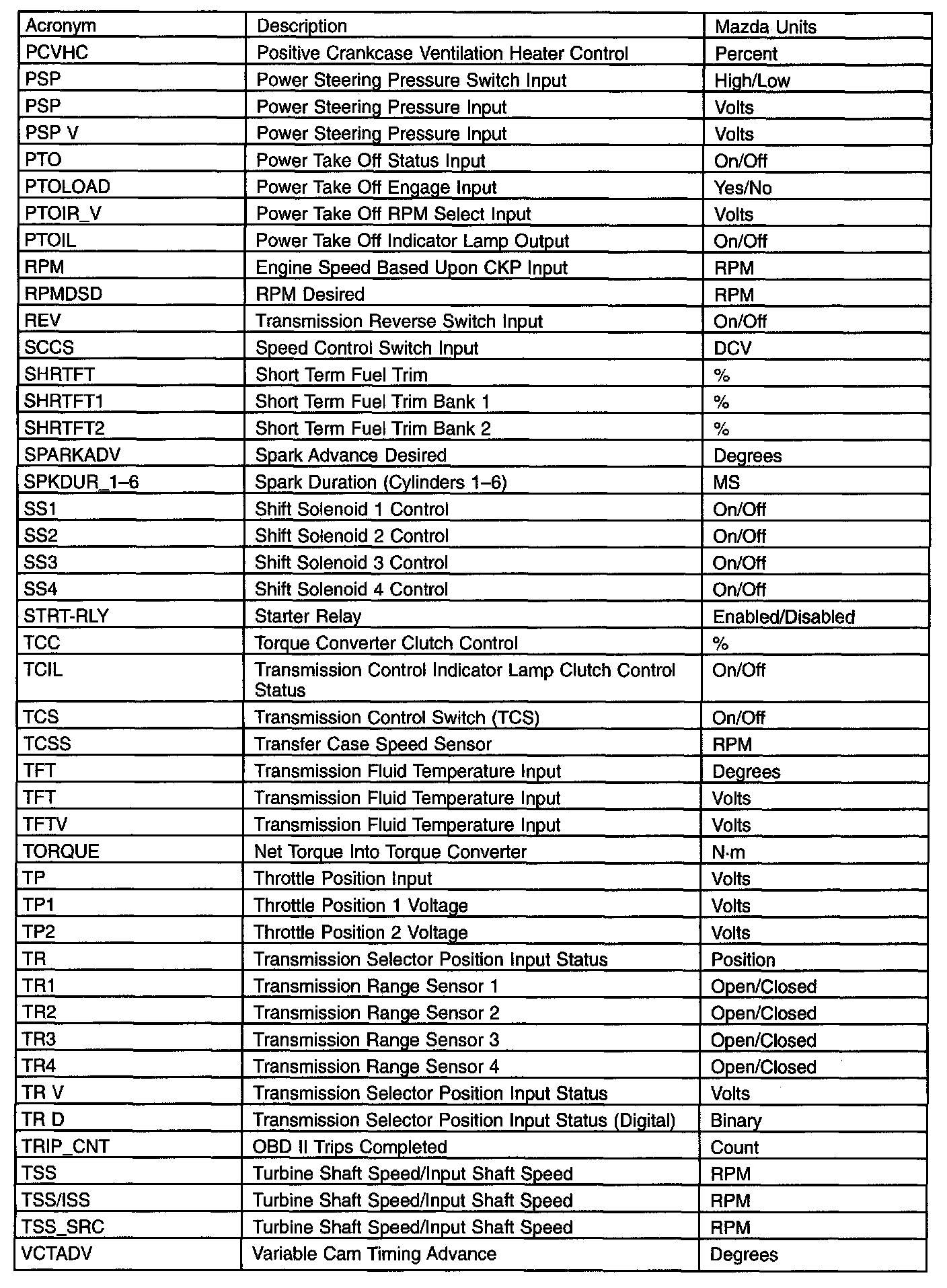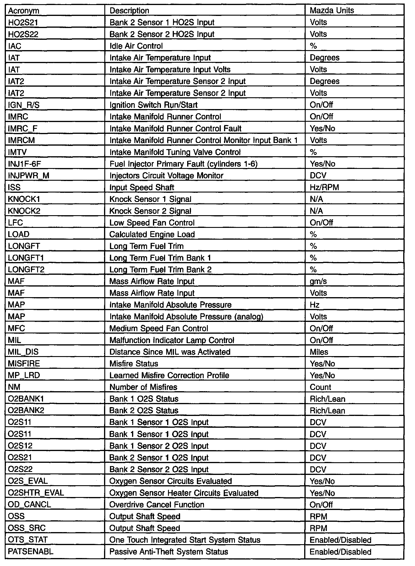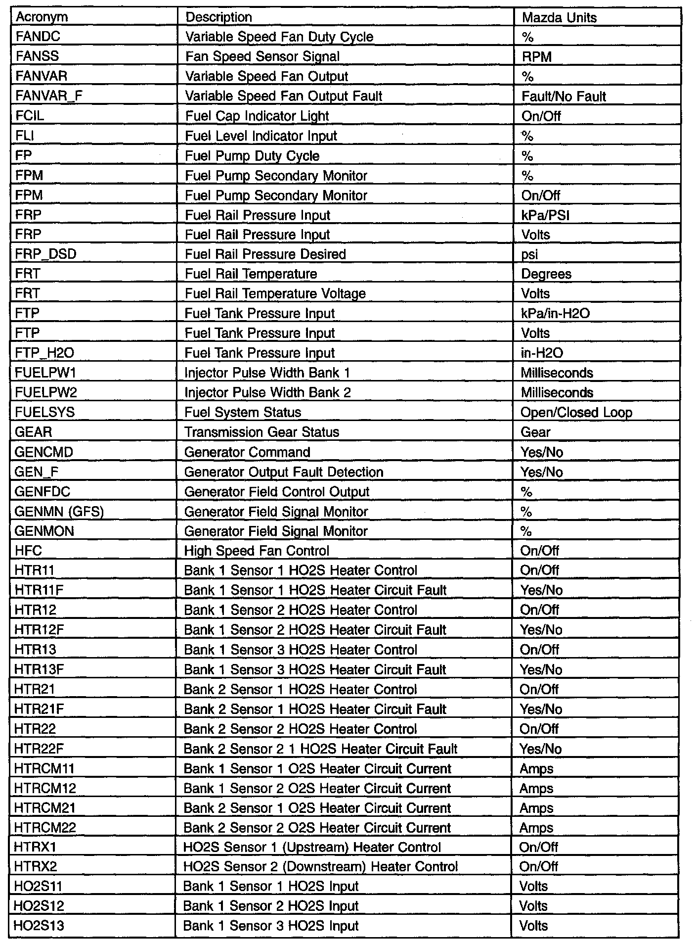 The parameter identification (PID) mode allows access to PCM information. This includes analog and digital signal inputs and outputs along with calculated values and the system status. There are 2 types of PID lists available and both are used throughout this manual. The first is generic (J1979) OBD PID list. This is a standard set of PIDs that all scan tools must be able to access. The second is a Mazda-specific (J2190) list which can be accessed by an appropriate scan tool. When accessing any of these PIDs, the values are continuously updated. The generic or Mazda PID list provides definitions and values in appropriate units. For more information, refer to the Society of Automotive Engineers (SAE) document J2205.