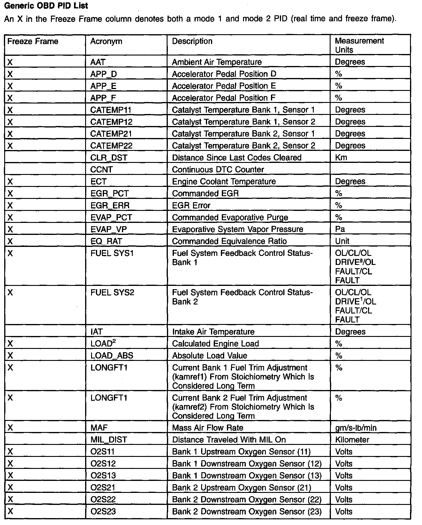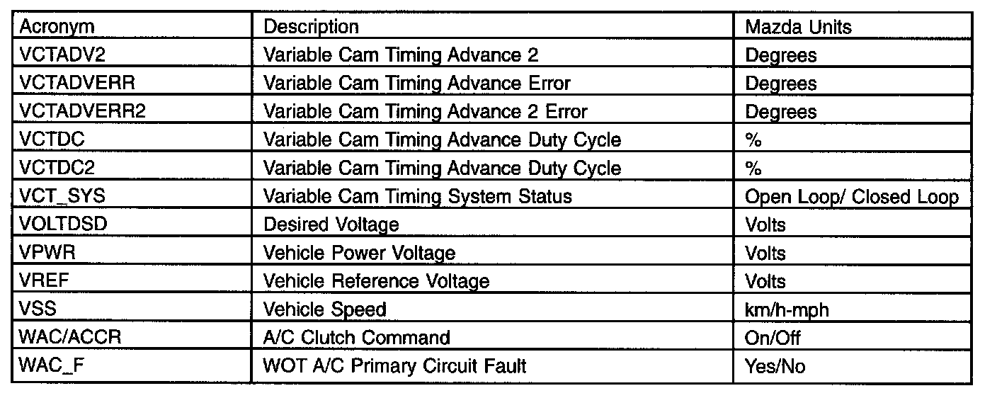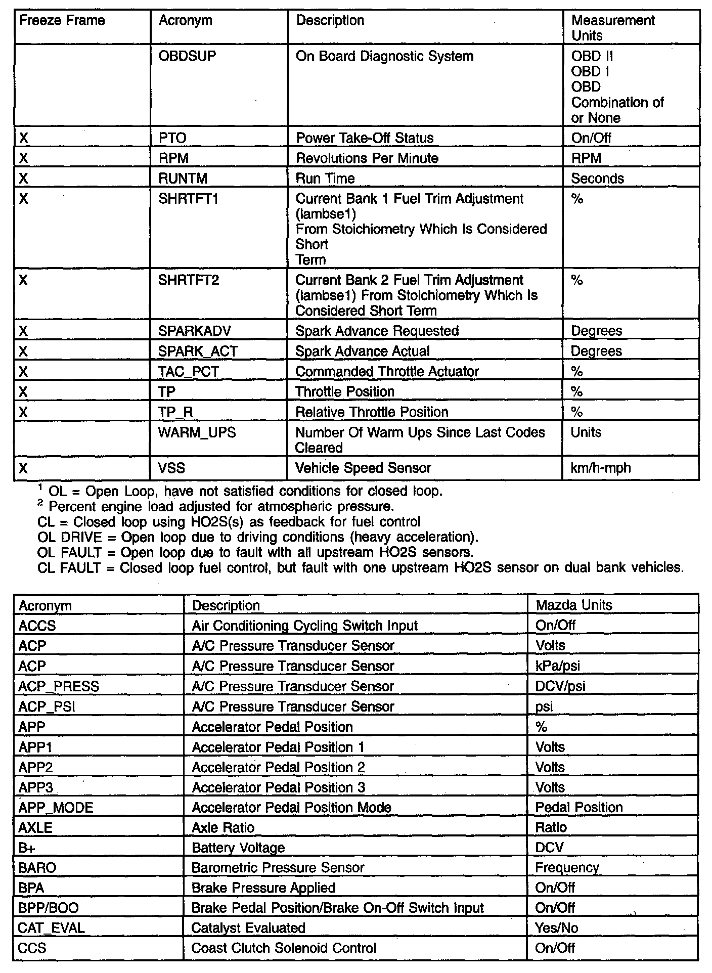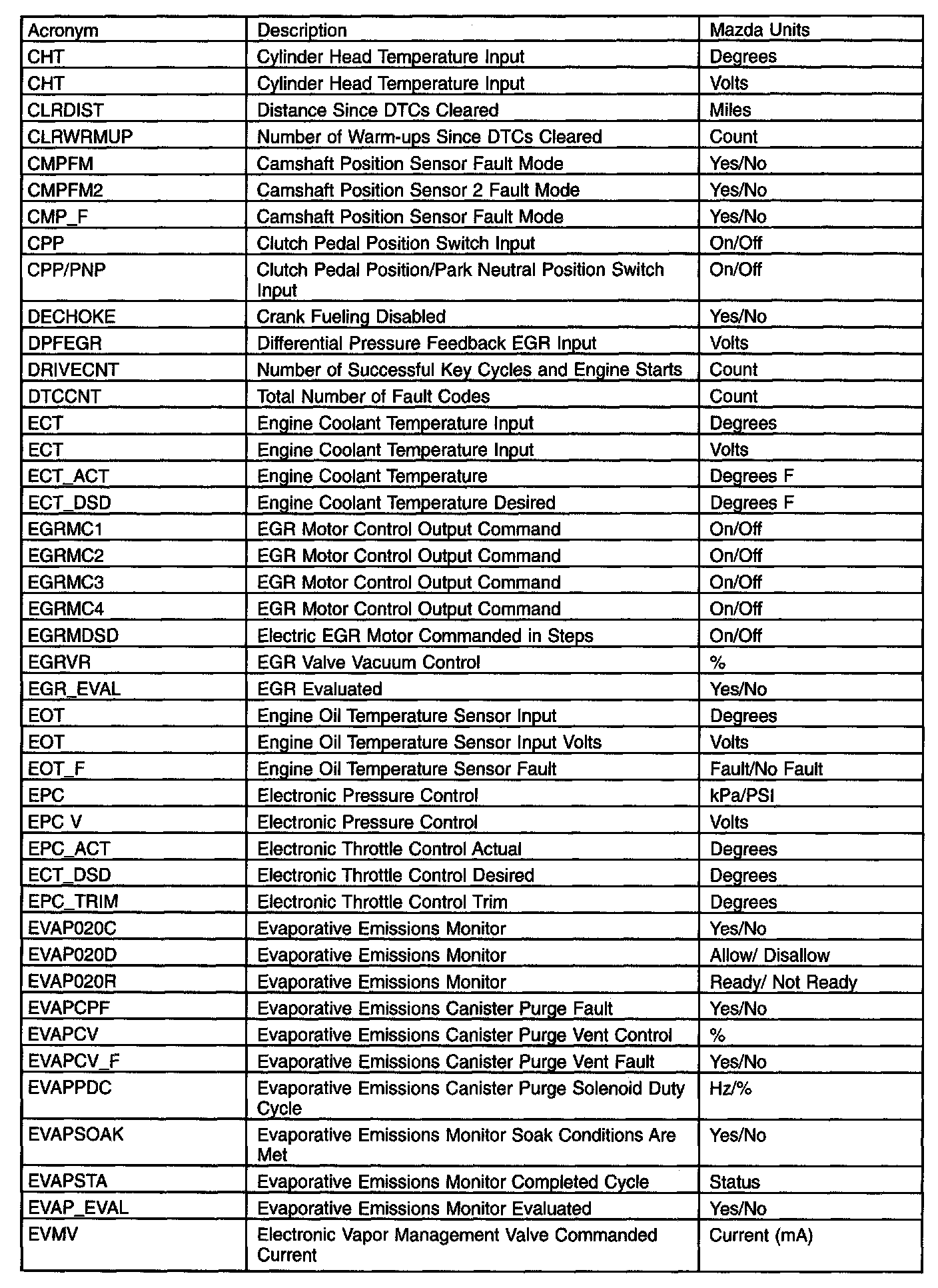 The parameter identification (PID) mode allows access to PCM information. This includes analog and digital signal inputs and outputs along with calculated values and the system status. There are 2 types of PID lists available and both are used throughout this manual. The first is generic (J1979) OBD PID list. This is a standard set of PIDs that all scan tools must be able to access. The second is a Mazda-specific (J2190) list which can be accessed by an appropriate scan tool. When accessing any of these PIDs, the values are continuously updated. The generic or Mazda PID list provides definitions and values in appropriate units. For more information, refer to the Society of Automotive Engineers (SAE) document J2205.