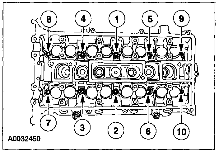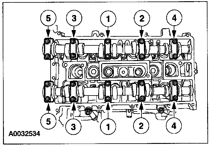Stage 1: Tighten the camshaft bearing bolt caps one turn at a time until finger-tight.