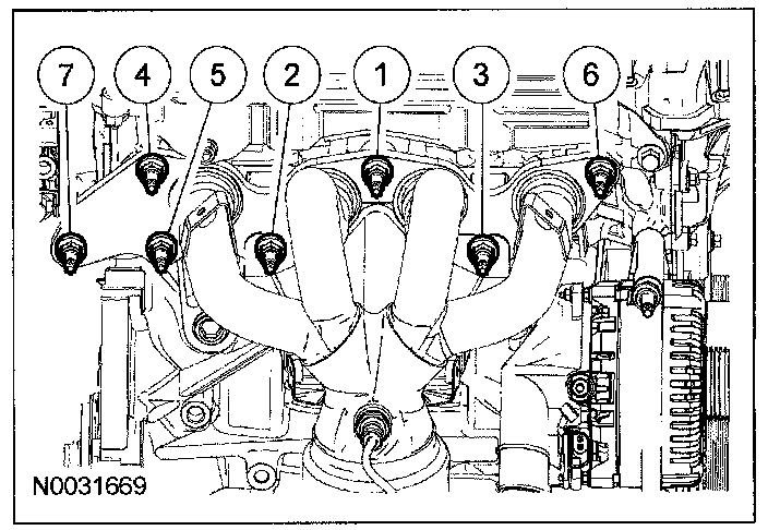 Position the catalytic converter and tighten the 7 new exhaust manifold nuts in the sequence shown in 2 stages.