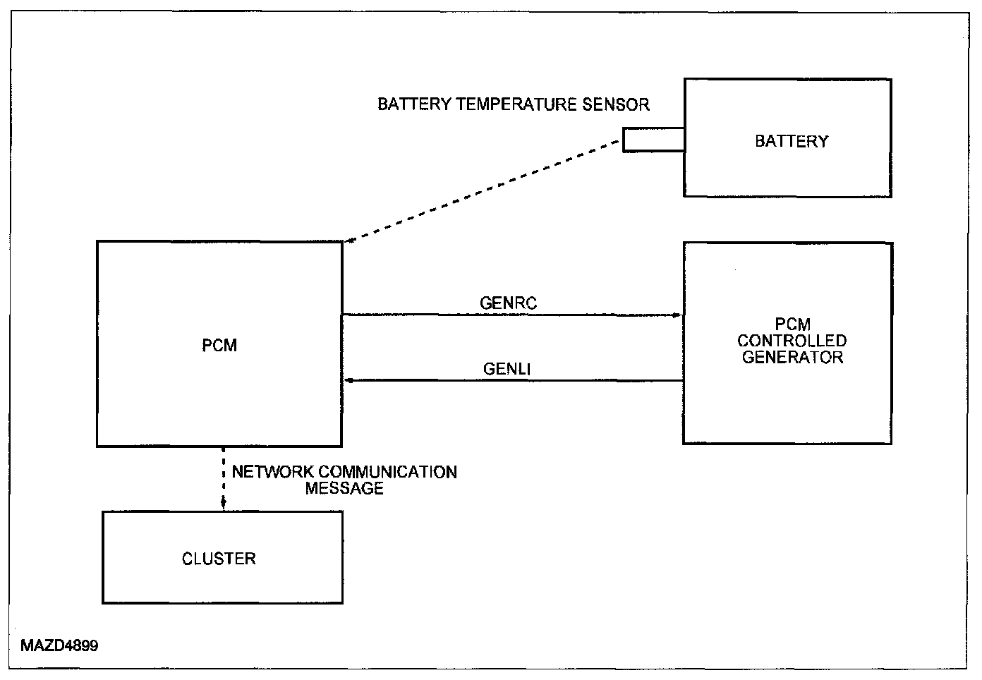 If the PCM detects a charging system error, it broadcasts a low voltage telltale (ON) network communication message which tells the cluster to illuminate the charge indicator. The charge indicator is illuminated if the PCM does not see a signal on the GENLI circuit for a time period greater than 500 milliseconds. This telltale command is also used to indicate over-voltage conditions detected by the PCM-controlled generator.