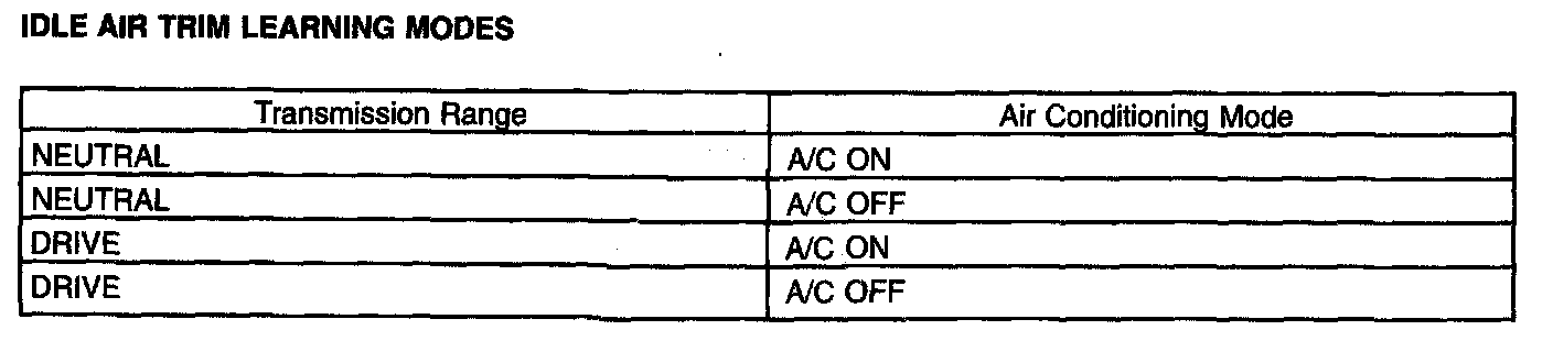 Once the KAM has been reset, the engine must idle for 15 minutes (actual time varies between strategies) to learn new idle air trim values. Idle quality improves as the strategy adapts. Adaptation occurs in 4 separate modes as shown in the following table.