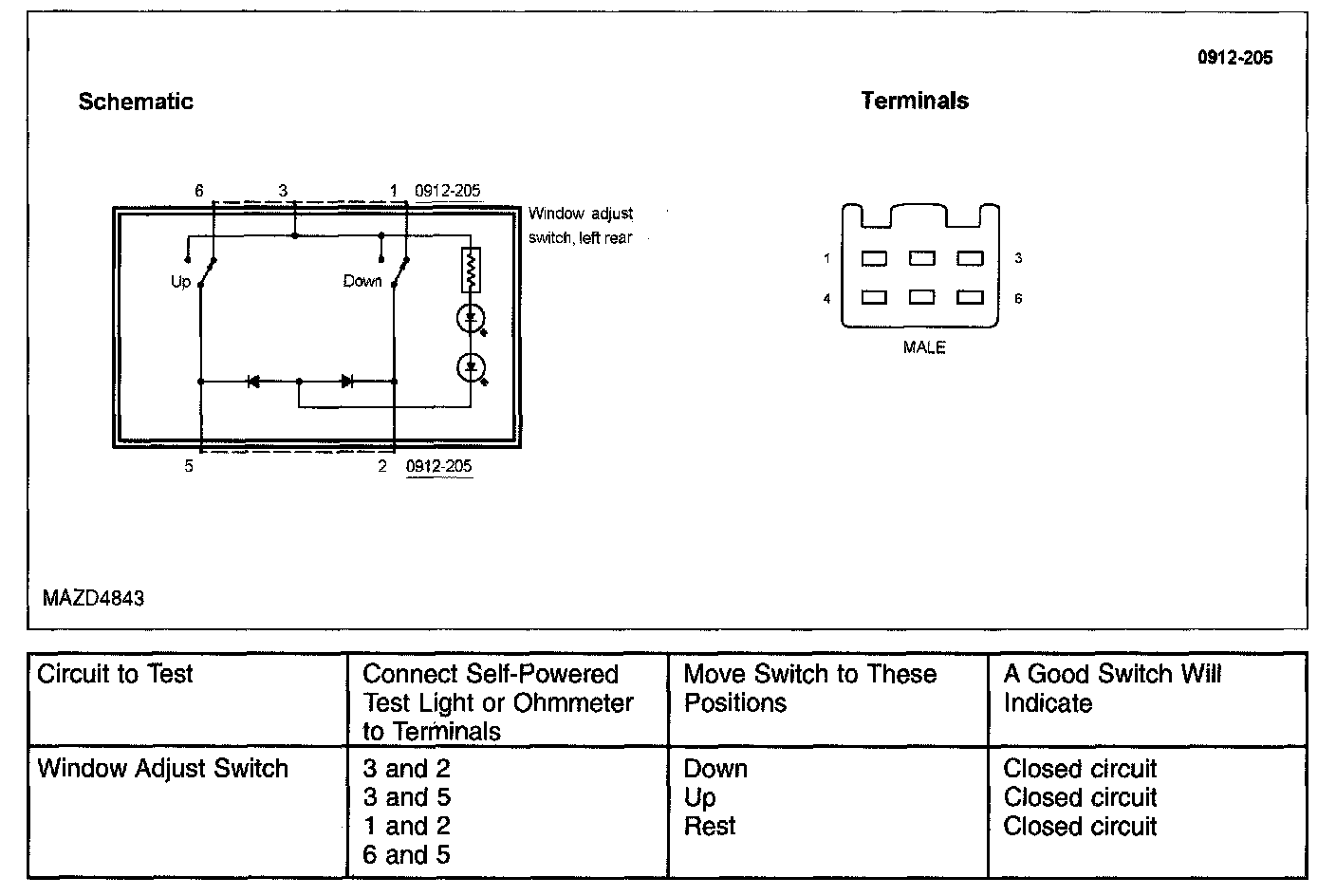 2. Inspect for continuity between the window control switch terminals using a self-powered test light or an ohmmeter.
