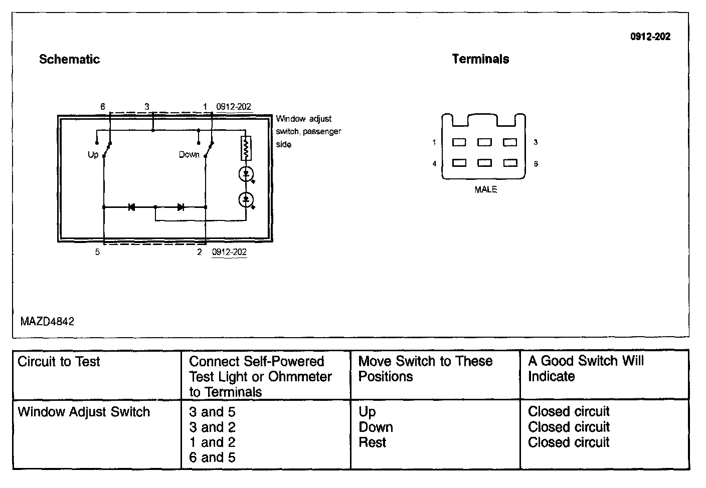 2. Inspect for continuity between the window control switch terminals using a self-powered test light or an ohmmeter.