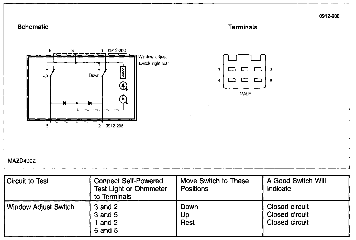 2. Inspect for continuity between the window control switch terminals using a self-powered test light or an ohmmeter.