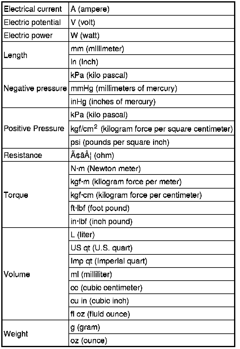 When the data indicates upper and lower limits, the converted values are rounded down if the SI unit value is an upper limit and rounded up if the SI unit value is a lower limit. Therefore, converted values for the same SI unit value may differ after conversion. For example, consider 2.7 kgf/cm2 in the following specifications:210 - 260 kPa {2.1 - 2.7 kgf/cm2, 30 - 38 psi}270 - 310 kPa {2.7 - 3.2 kgf/cm2, 39 - 45 psi}The actual converted values for 2.7 kgf/cm2 are 264 kPa and 38.4 psi. In the first specification, 2.7 is used as an upper limit, so the converted values are rounded down to 260 and 38. In the second specification, 2.7 is used as a lower limit, so the converted values are rounded up to 270 and 39.