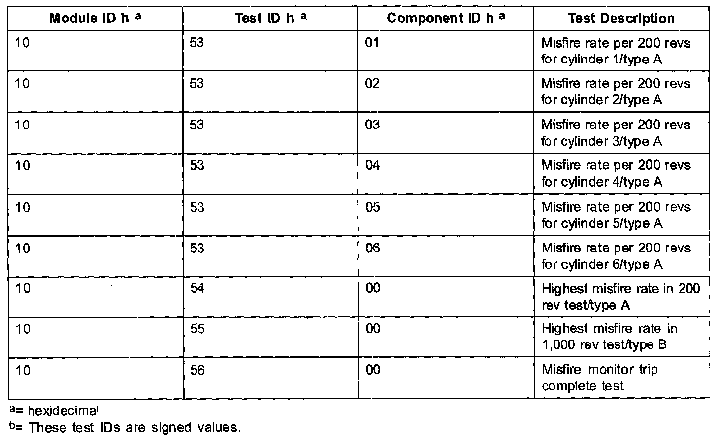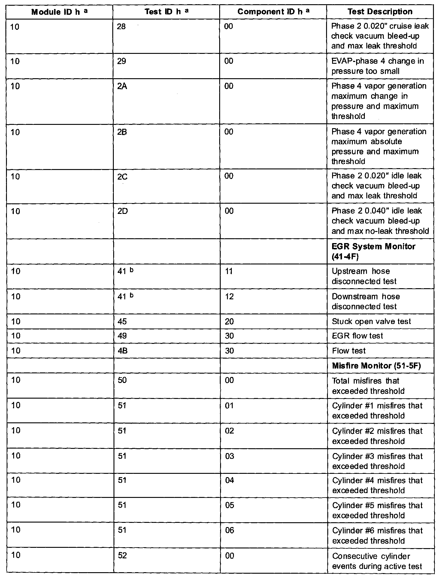 Diagnostic Monitoring Test ResultsThe purpose of this test mode is to allow access to the results of OBD II monitor diagnostic test results. The test values that are stored at the time of the particular monitor completion are displayed when the particular test identification is requested. See the table for test information.