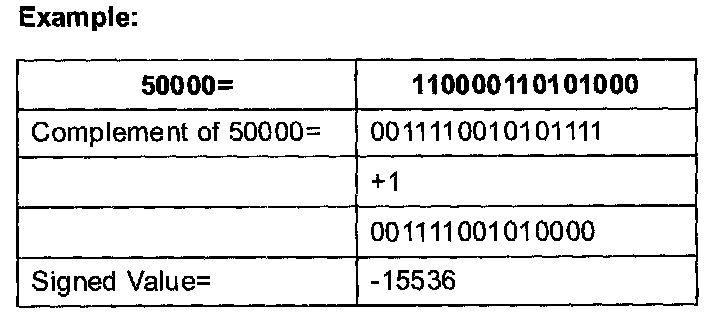The conversion is done as follows: If the value is > 32767 then complement (change 0's to 1's and 1's to 0's), add 1 and a negative sign.