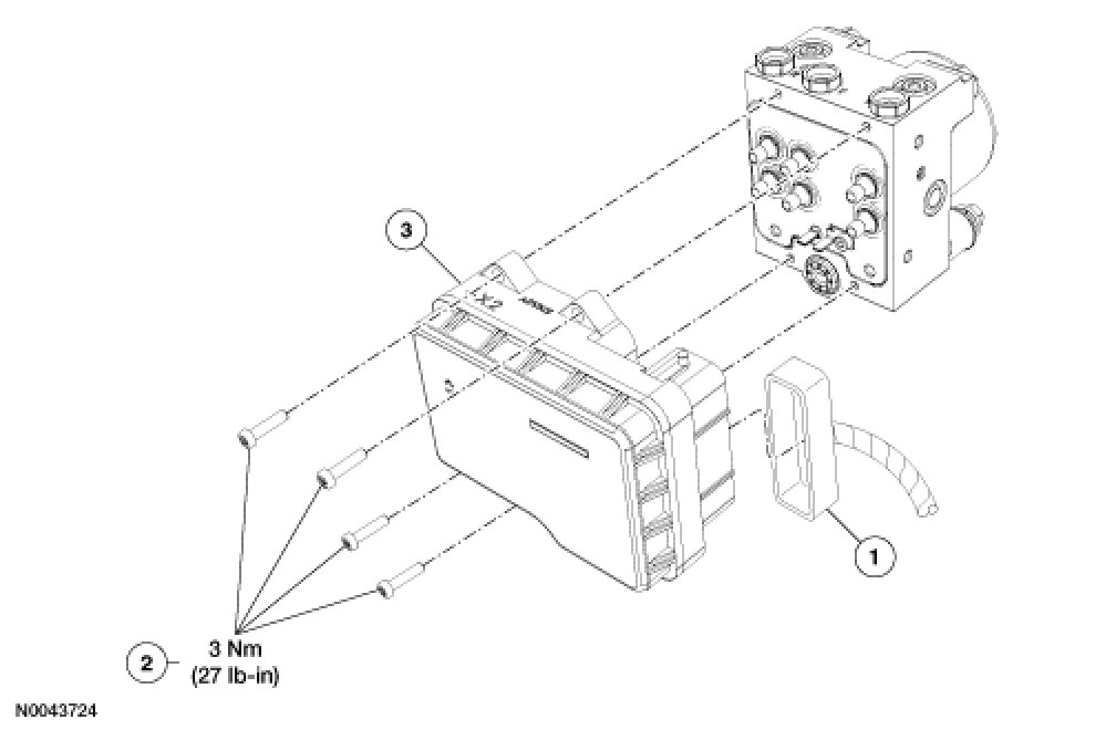 NOTE:The anti-lock brake system (ABS) module bolts must be removed and installed in the sequence shown.Remove the 4 anti-lock brake system (ABS) module bolts in the sequence shown.