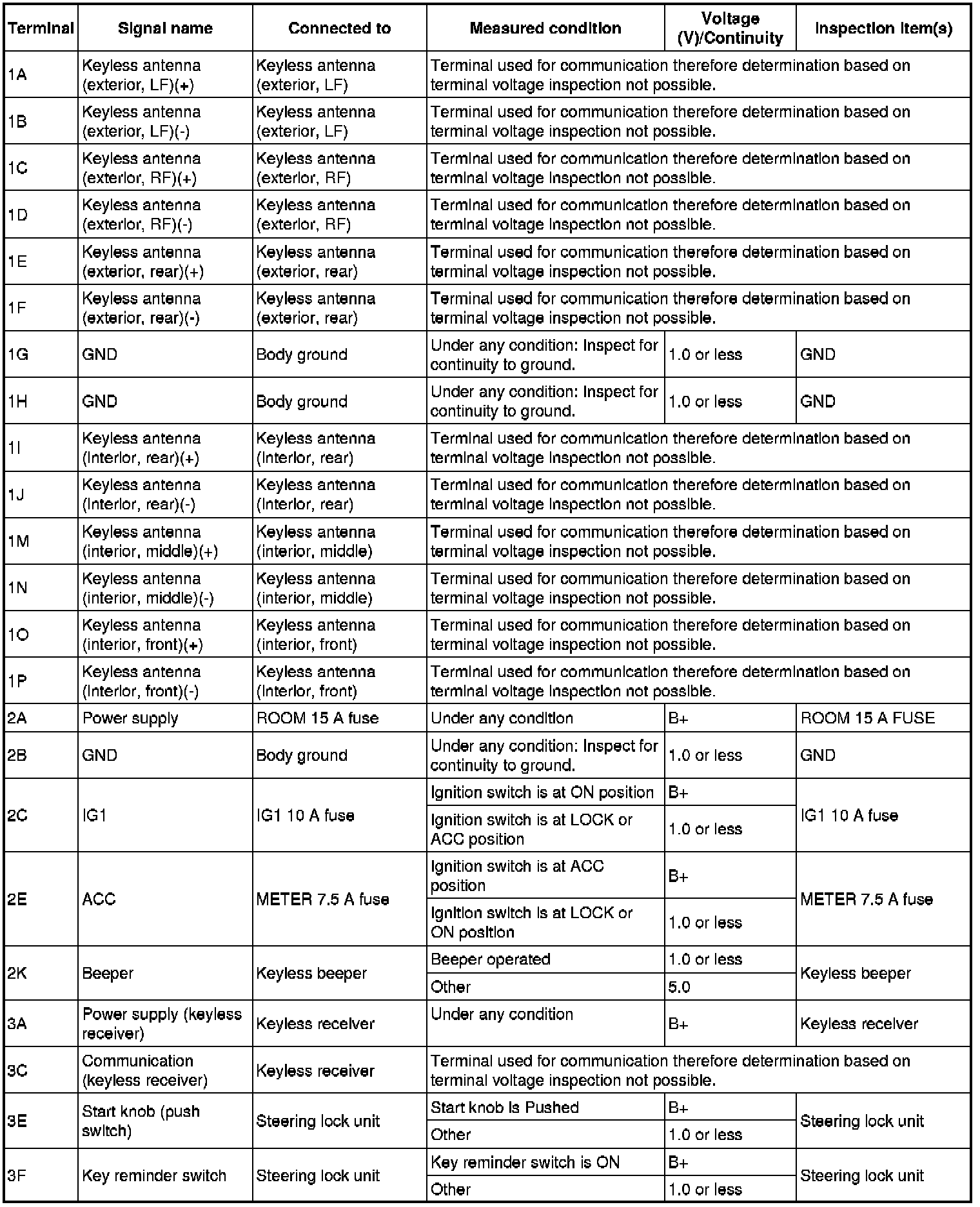 1. Measure the voltage or inspect for continuity according to the Terminal Voltage Table (Reference).