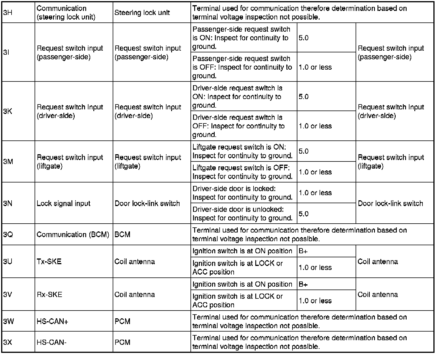 - If the voltage is not as specified in the Terminal Voltage Table (Reference), inspect the parts under "Inspection item(s)" and related wiring harnesses.