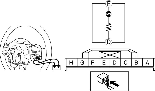 5. Apply battery positive voltage to cruise control switch terminal E, and connect terminal D to ground.
