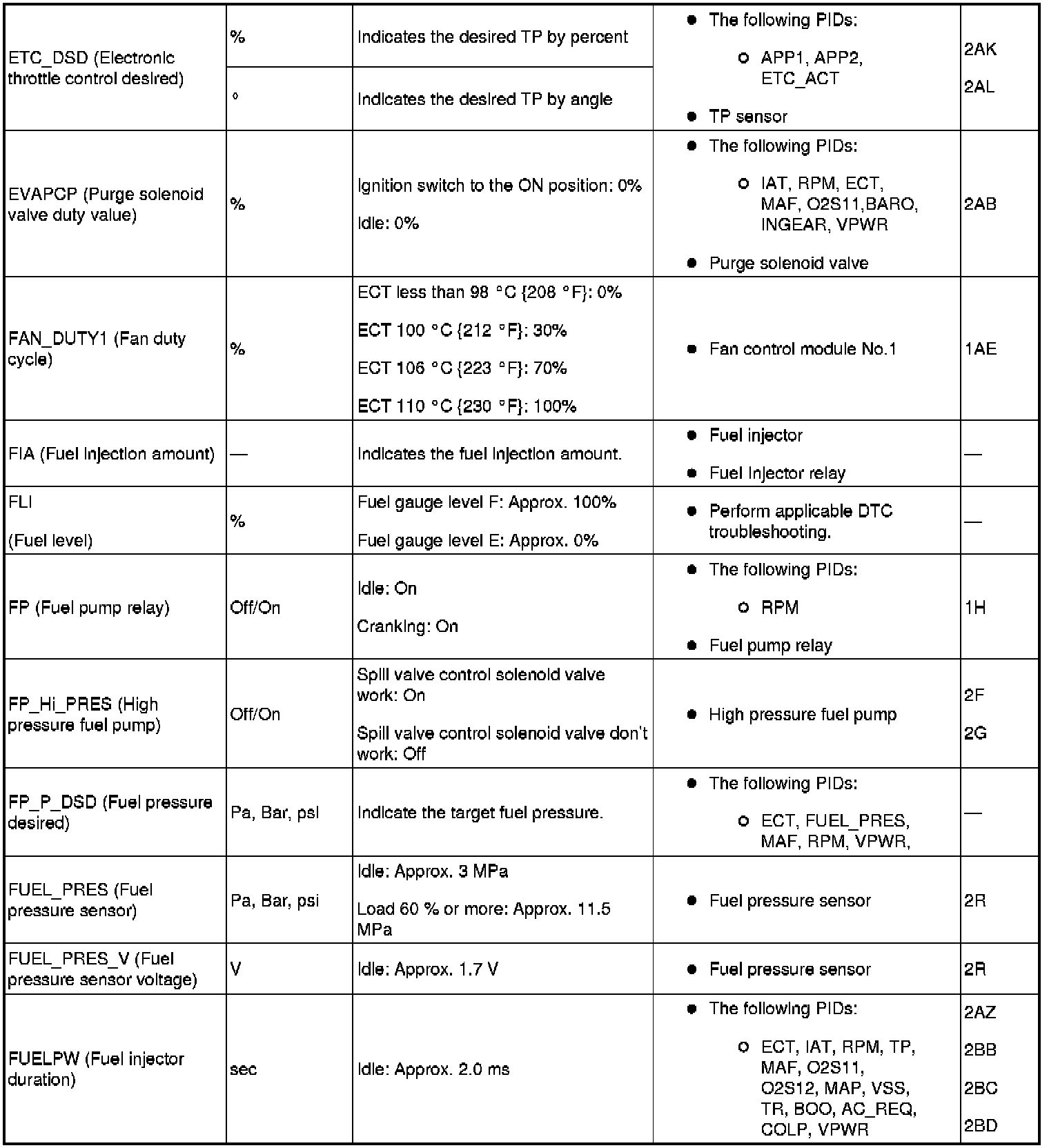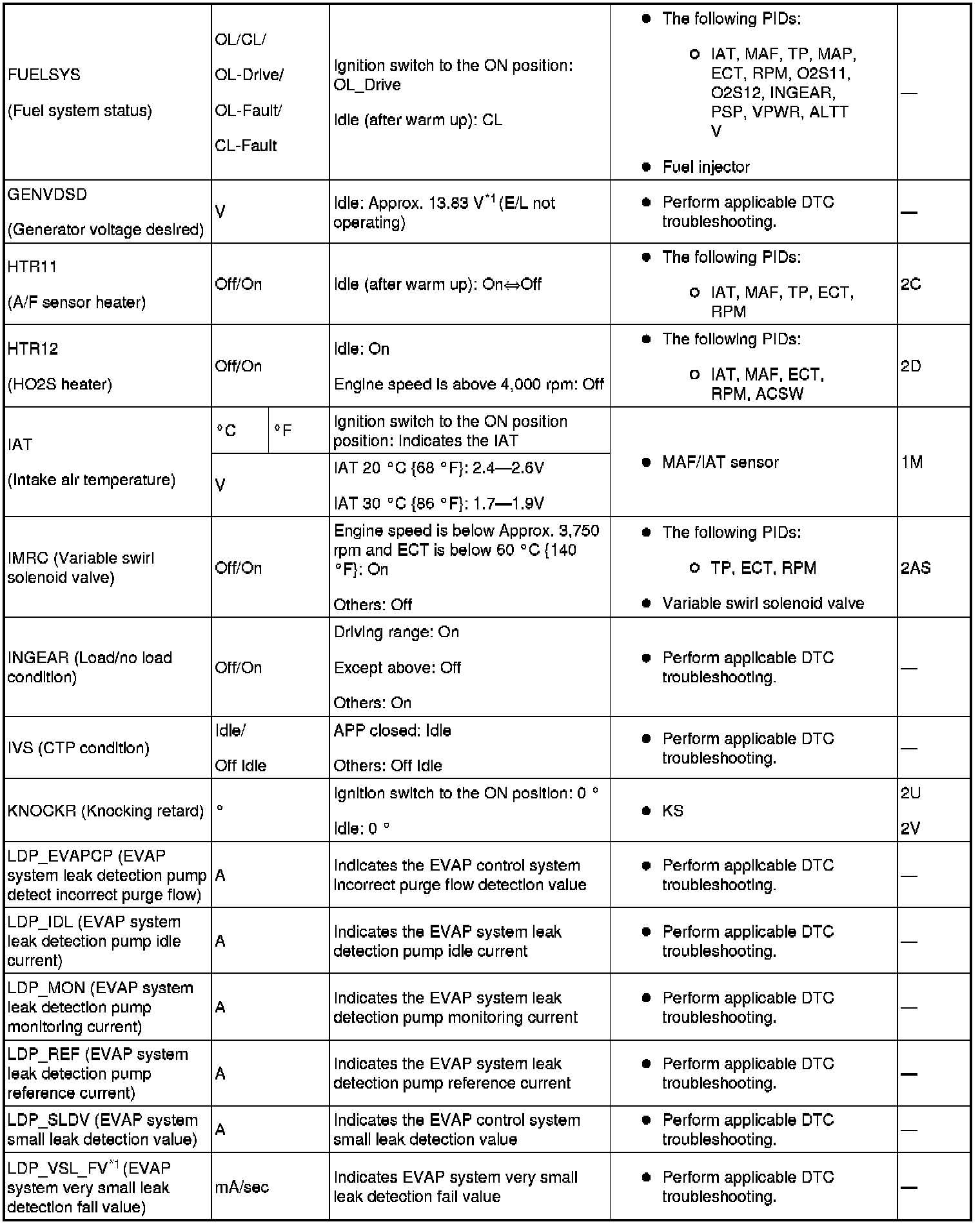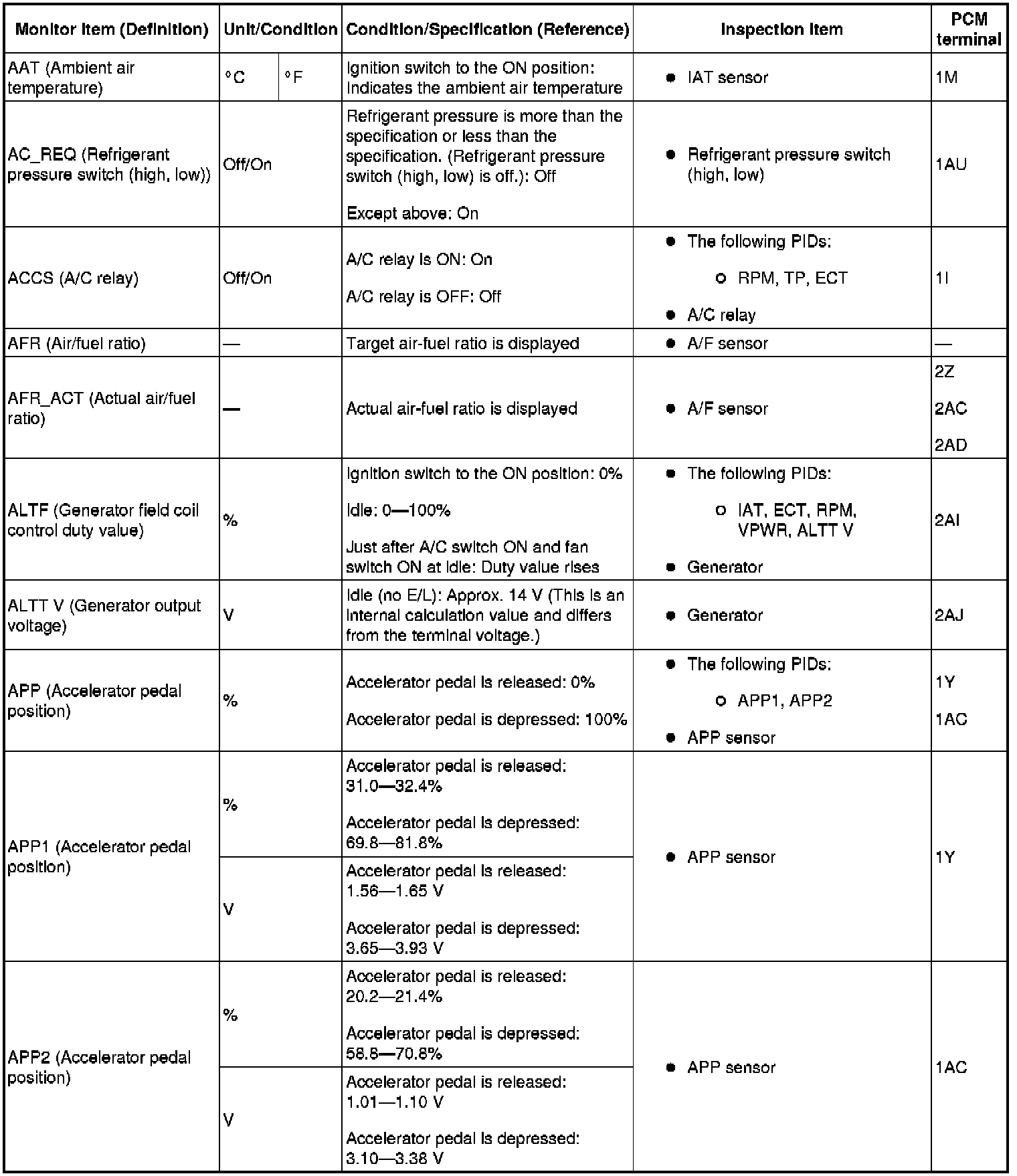 - If PID value is not within the specification, follow the instructions in the "Inspection item" column.