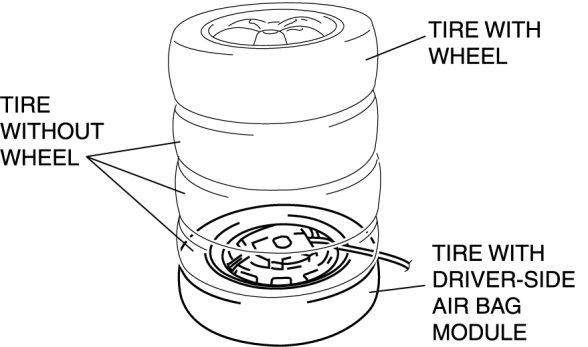 5. Stack the tire with the passenger-side air bag module on top of two tires without wheels. Stack a tire without a wheel on top of the tire with the passenger-side air bag module, and then stack another tire with a wheel on the very top.