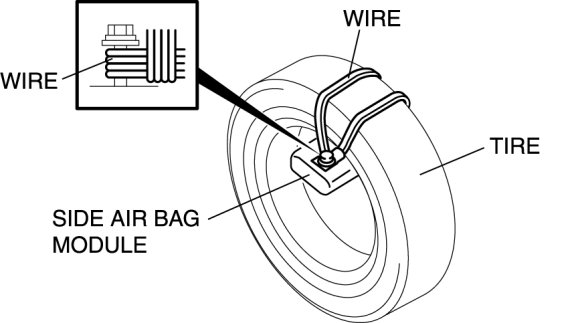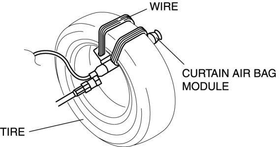 4. Secure the curtain air bag module to the tire, by wrapping a wire (cross section 1.25 mm2 {0.002 in2} or more) through the tire and the bolt installation holes at least 4 times as shown in the figure.