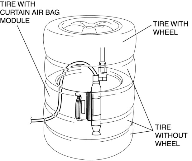 5. Stack the tire with the curtain air bag module on top of two tires without wheels. Stack a tire without a wheel on top of the tire with the curtain air bag module, and then stack another tire with a wheel on the very top.