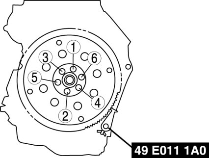 Tighten the new drive plate mounting bolts in two or three steps in the order shown.