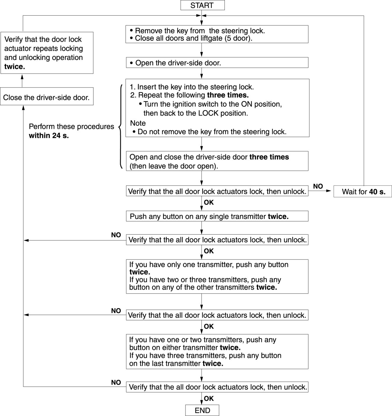 - After ID code registering, remove the key from the steering lock and verify that all doors lock/unlock normally using the transmitter.