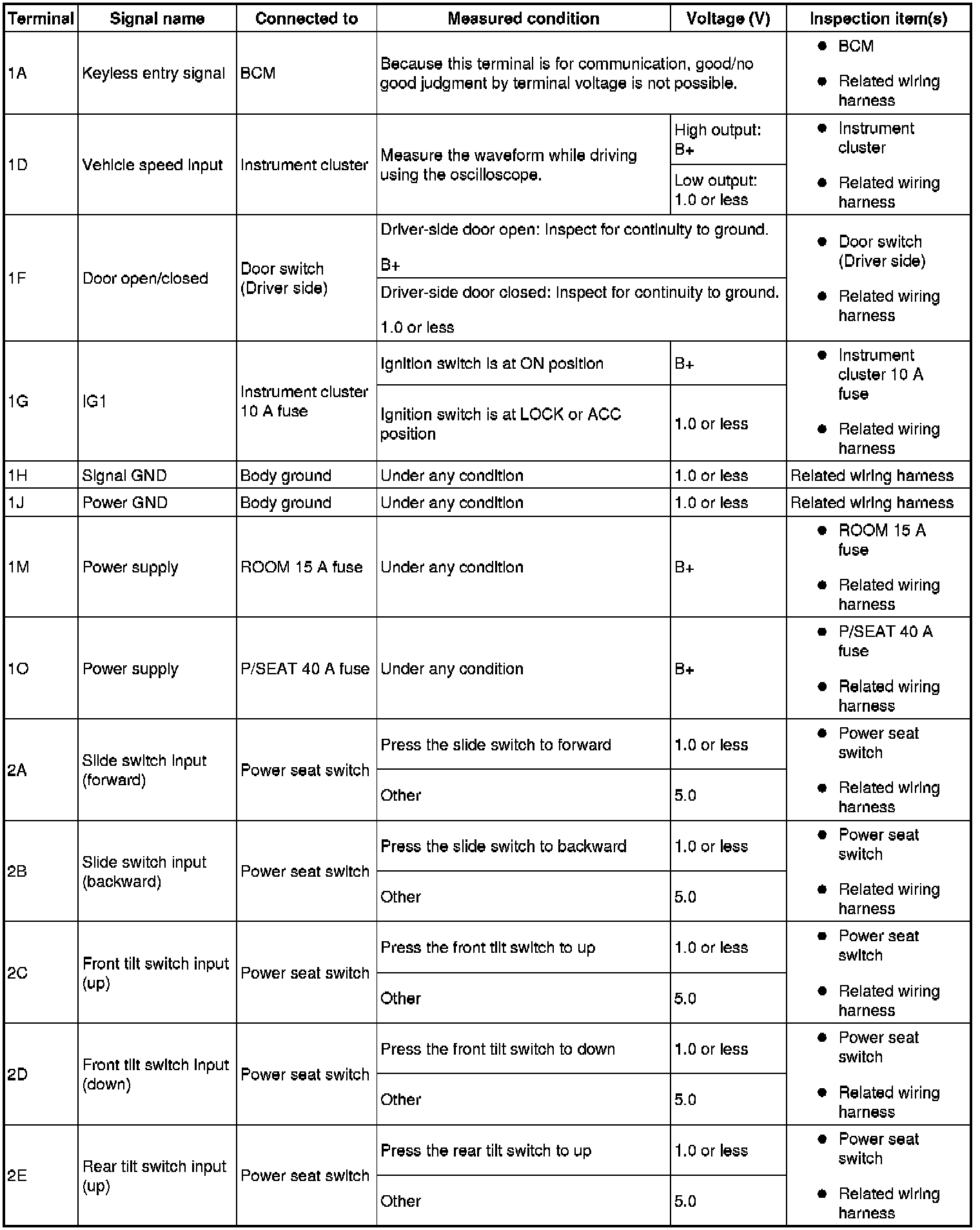 - If the voltage is not as specified in the Terminal Voltage Table (Reference), inspect the parts under "Inspection item(s)" and related wiring harnesses.