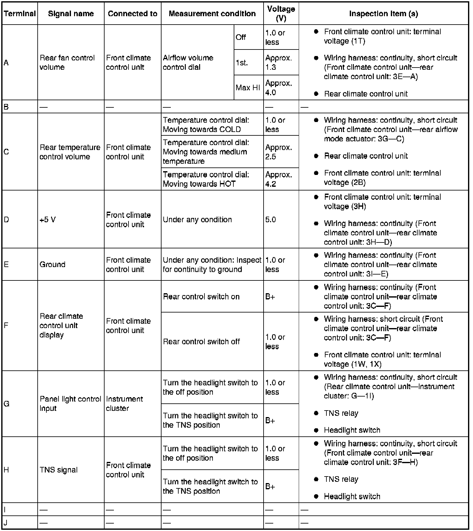 4. By inserting the positive (+) lead of the tester into each rear climate control unit terminal, measure the voltage according to the terminal voltage table.