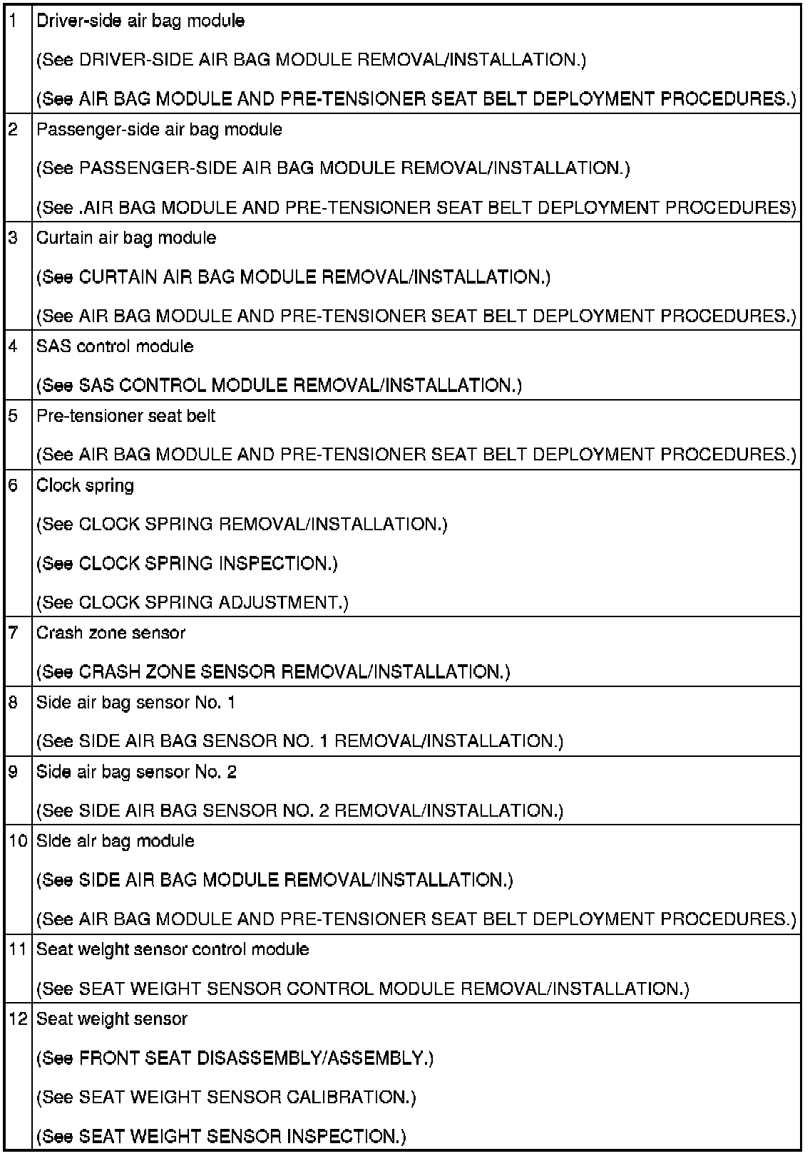 AIR BAG SYSTEM LOCATION INDEX