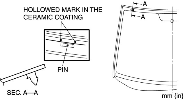 5. Align the marks made before removal and install the pin to the windshield referring to the figure. (when reusing the glass, and the pin was removed)