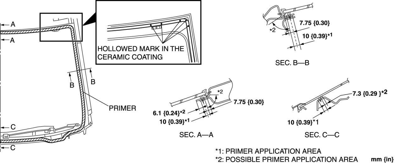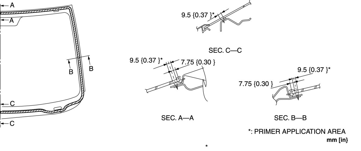 9. If the sealant has come off completely in any one place, apply some primer after degreasing, and allow it approx. 30 min to dry. Then apply 2 mm {0.08 in} thickness of new sealant.