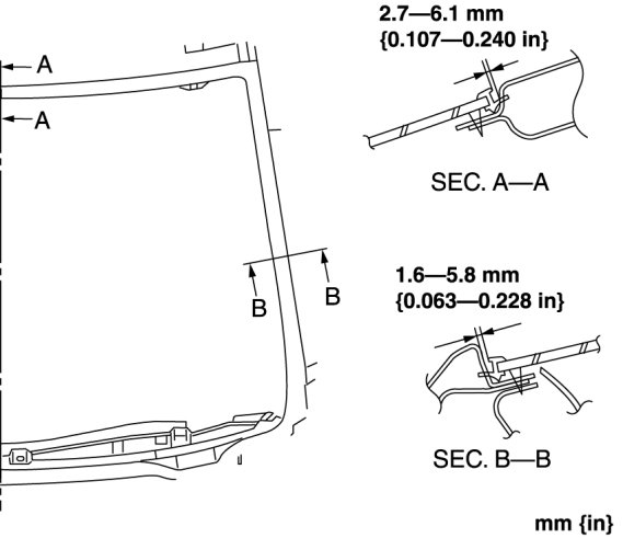 14. Verify that the clearance of the A-pillar is within the range shown in the figure, and press along the perimeter of the glass.