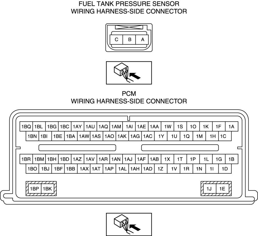 - Fuel tank pressure sensor terminal A and PCM terminal 1AB