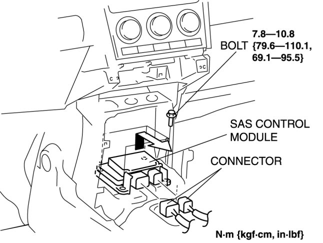 - Connecting the SAS control module with the SAS control module not securely fixed to the vehicle is dangerous. When the ignition switch is turned to the ON position, the SAS control module could tilt causing the SAS control module to detect that the vehicle is in a rollover condition, which may accidentally operate (deploy) the curtain air bag module and pre-tensioner seat belt. Therefore, before turning the ignition switch to the ON position with the connector connected, securely fix the SAS control module to the vehicle.