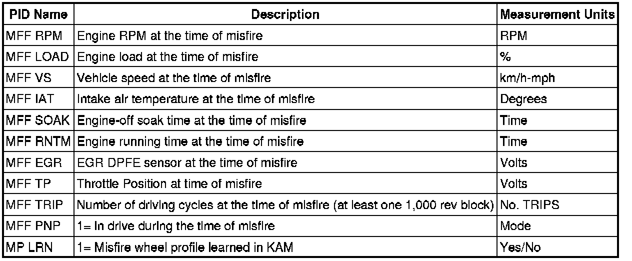 NOTE:MFF PIDs are supported on all vehicles but may not be available on all scan tools because enhanced PID access may vary by scan tool manufacturer. Misfire Freeze-Frame PIDs
