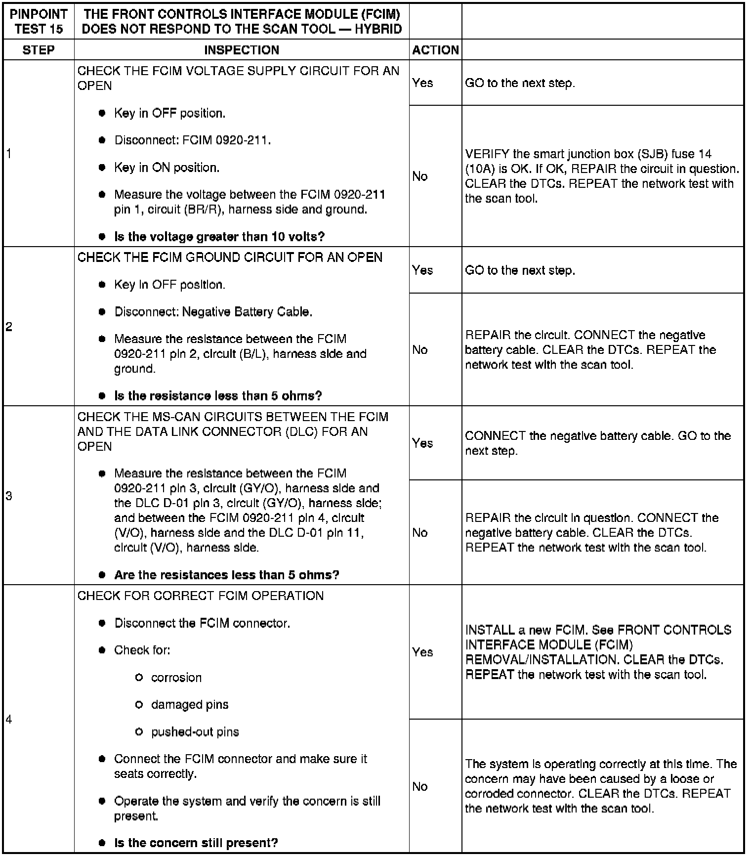PINPOINT TEST 15: THE FRONT CONTROLS INTERFACE MODULE (FCIM) DOES NOT RESPOND TO THE SCAN TOOL - HYBRID