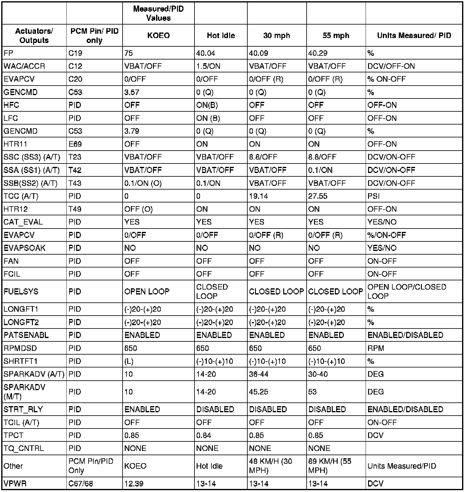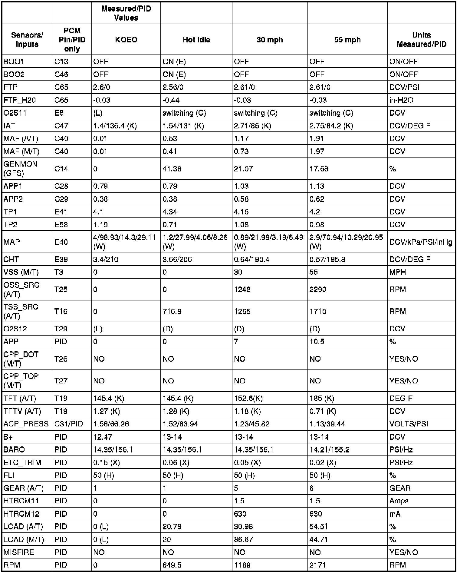 PID/DATA MONITOR REFERENCE VALUE (2.5L)
